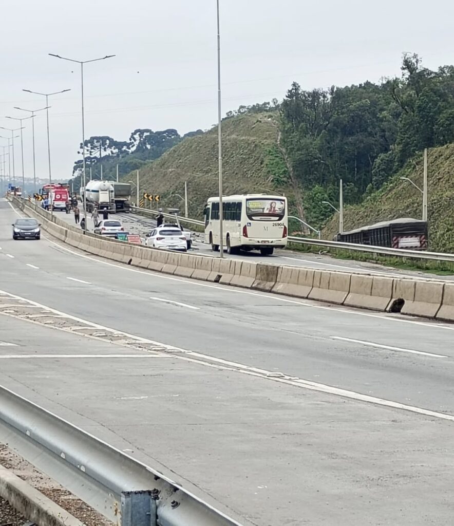 O acidente ocorreu durante obras na rodovia, quando o motorista tentou desviar para evitar colisão com veículos menores. Ele acabou atingindo a traseira de uma carreta, e em seguida uma Saveiro foi atingida de raspão. O condutor sofreu ferimentos, foi atendido no local e levado ao hospital. Fonte: Jornal Expresso