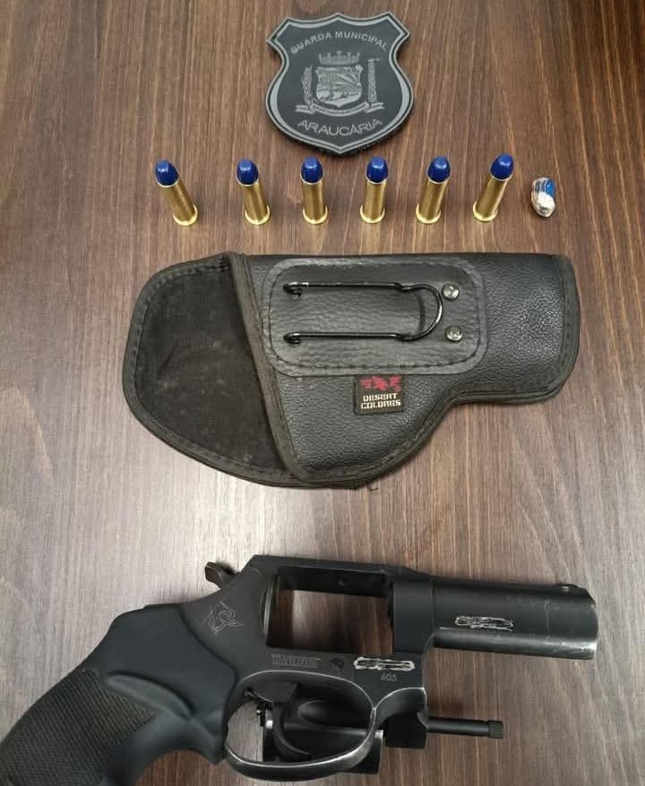 Um jovem de 23 anos foi detido pela Guarda Municipal na tarde desta segunda-feira (10) após ser identificado por testemunhas como o autor de ao menos quatro disparos contra a residência de um homem envolvido em uma briga de bar na Vila do Sossego, área rural de Araucária. A equipe policial localizou o suspeito e a arma usada, um revólver calibre .357 com numeração raspada, escondida próximo a um chiqueiro, além de cinco munições intactas. O homem foi levado à Delegacia de Polícia Civil e apresentado à autoridade competente juntamente com o armamento apreendido.