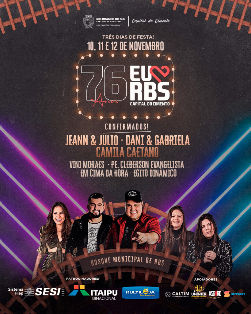 Nossa festa para celebrar os 76 anos de emancipação de Rio Branco do Sul tem uma NOVA DATA! Marque no seu calendário: 10, 11 e 12 de Novembro. E não é só isso, preparamos novas atrações incríveis!