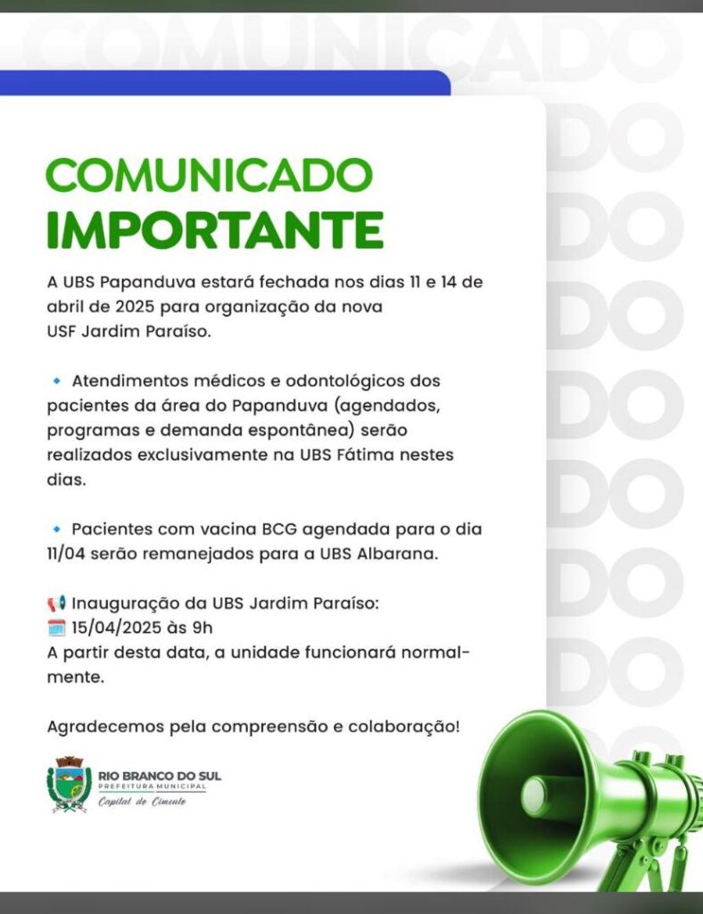 Prefeitura de Rio Branco do Sul Informa Alterações no Atendimento da UBS Papanduva e Anuncia Inauguração da UBS Jardim Paraíso