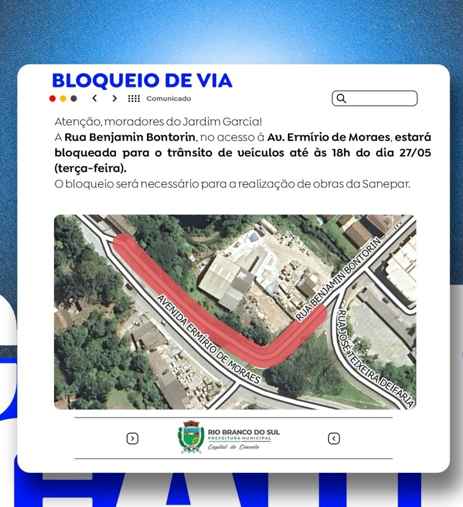 Atenção, motoristas: interdição na Rua Benjamin Bontorin para obras da Sanepar A Prefeitura de Rio Branco do Sul informa que, devido à realização de obras da Sanepar, a Rua Benjamin Bontorin, no acesso à Avenida Emírio de Moraes, no bairro Jardim Garcia, estará bloqueada para o trânsito a partir das 8h da manhã desta segunda-feira, […]