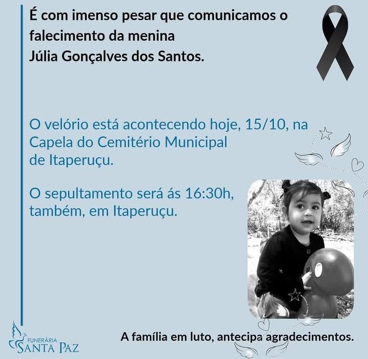 Informamos com profundo pesar a morte da menina Júlia Gonçalves dos Santos. O velório ocorre hoje, 15 de outubro, na Capela do Cemitério Municipal de Itaperuçu, com sepultamento marcado para as 16h30 no mesmo local. Neste momento difícil, prestamos solidariedade aos familiares e amigos, desejando força e conforto a todos que amavam Júlia. A família […]