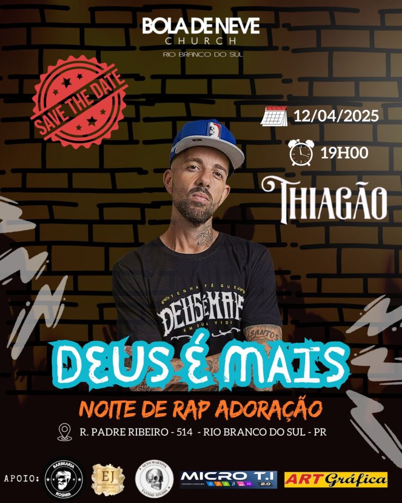Fala, galera!Hoje teremos um momento muito especial: uma noite de RAP com o nosso irmão Thiagão! O evento será na Igreja Bola de Neve Rio Branco do Sul, a partir das 19h.Você curte esse estilo de som? Conhece alguém que gosta? Então chama a galera e venha viver um tempo de adoração e louvor ao […]