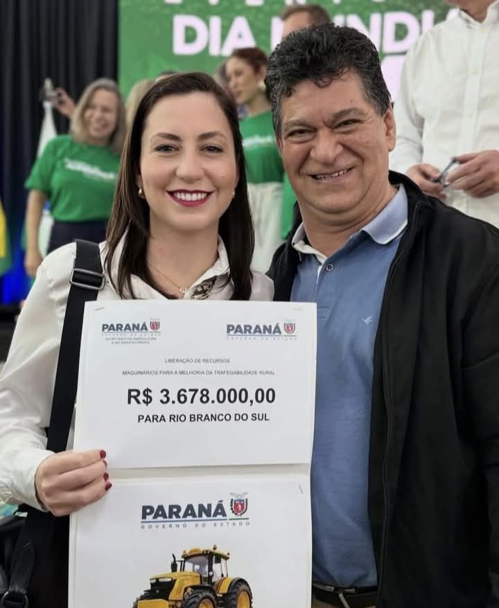 Rio Branco do Sul recebeu R$ 3.678.000 do governo do estado para a compra de máquinas e equipamentos. O repasse foi feito pelo governador Ratinho Júnior e recebido pela prefeita, com a presença de Eloir Bueno. O recurso será utilizado na aquisição de equipamentos para a manutenção das ruas do município. Fonte: Jornal Expresso