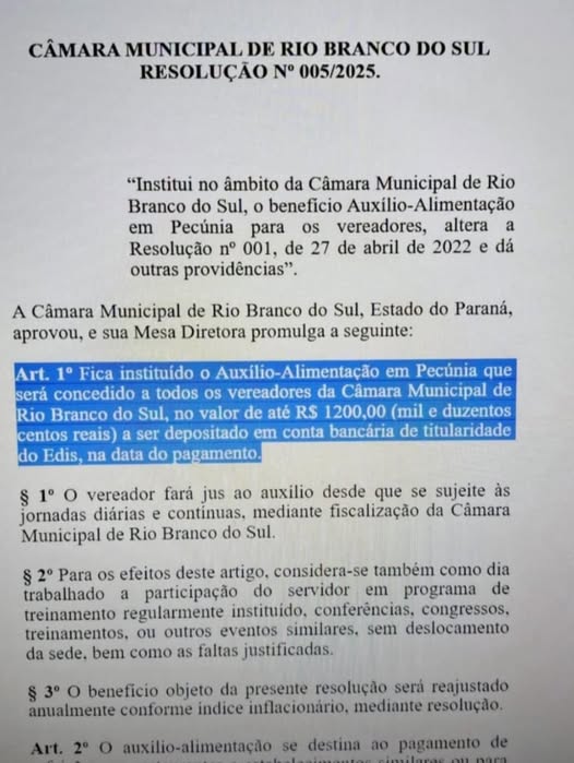 Os vereadores de Rio Branco do Sul receberão um auxílio vale alimentação no valor de R$ 1.200 por mês. O custo dessa despesa será arcado pelo município. A iniciativa tem gerado debates sobre o impacto financeiro para a comunidade. Fonte: Portal Rio Branco do Sul