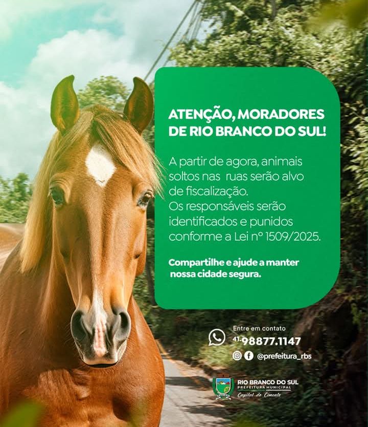 A Prefeitura de Rio Branco do Sul informa que a partir de agora haverá fiscalização rigorosa para animais de grande porte soltos nas ruas. Os responsáveis serão identificados e punidos conforme a Lei nº 1509/2025, que visa garantir a segurança nas vias públicas e o bem-estar dos animais. A população é incentivada a compartilhar a […]