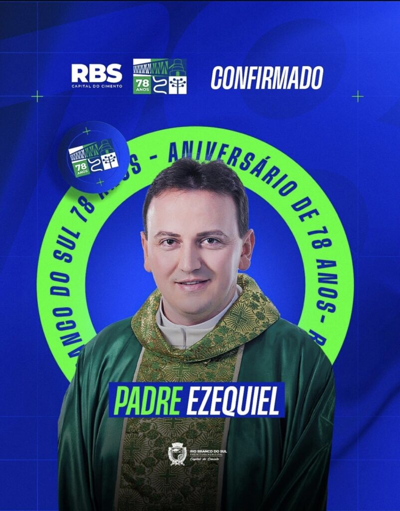 Padre Ezequiel participará da programação do aniversário de 78 anos de Rio Branco do Sul, trazendo um momento especial de fé e música. O Portal Rio Branco do Sul acompanhará todo o evento e informará cada detalhe aos seus leitores. Fonte: Prefeitura de Rio Branco do Sul