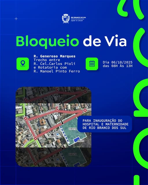 Atenção, motoristas e pedestres! No dia 06 de outubro, em razão da inauguração do novo Hospital e Maternidade de Rio Branco do Sul, haverá bloqueio de trânsito na Rua Generoso Marques, das 8h às 13h. O trecho interditado será entre a Cel. Carlos Pioli e a rotatória com a Manoel Pinto Ferro. Contamos com a […]