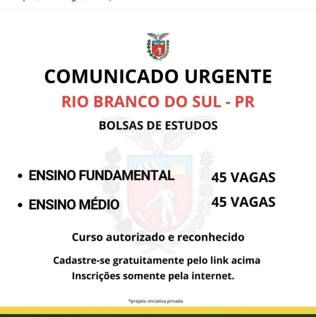 Estão abertas as inscrições para bolsas de estudos destinadas à conclusão do ensino fundamental e médio em Rio Branco do Sul, PR. Os interessados devem se inscrever exclusivamente pela internet, por meio do link: https://forms.gle/PkJQJVrUvaoMHBdB6. O cadastro é gratuito e os selecionados receberão informações posteriormente. Fonte: Jornal Rio Branco