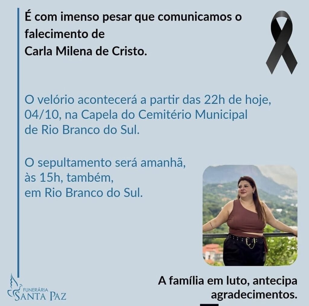 Com tristeza, informamos o falecimento de Carla Milena de Cristo, moradora de Rio Branco do Sul. Seu sorriso, alegria e carinho deixam saudade em familiares, amigos e na comunidade. O velório começa às 22h deste sábado (4), na Capela Mortuária Municipal de Rio Branco do Sul. O sepultamento será no domingo (5), às 15h, no […]