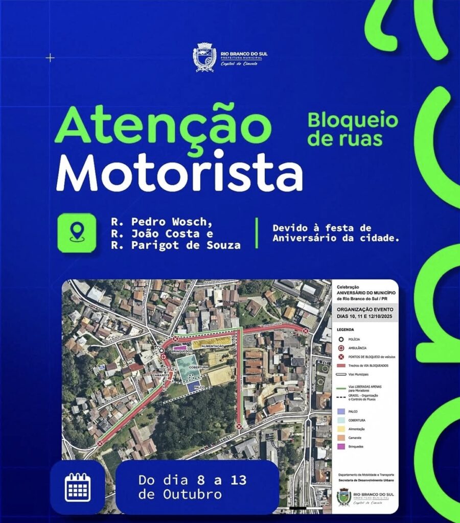 A Prefeitura de Rio Branco do Sul anunciou bloqueios no trânsito de 8 a 13 de outubro durante a festa de aniversário do município. As ruas Pedro Wosch, João Costa e Parigot de Souza estarão fechadas para garantir a segurança do público e o bom andamento do evento. Moradores da região poderão acessar as áreas […]
