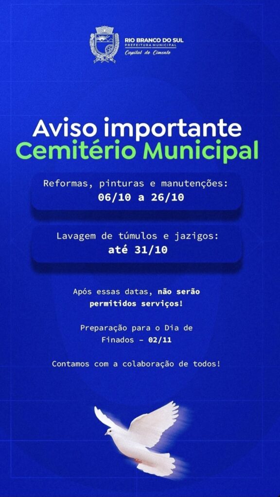 A Prefeitura de Rio Branco do Sul anunciou que o Cemitério Municipal passa por reformas, pinturas e manutenções entre os dias 6 e 26 de outubro. A lavagem de túmulos e jazigos estará permitida até 31 de outubro. Após essas datas, não serão autorizados serviços no local, garantindo a limpeza e organização para o Dia […]