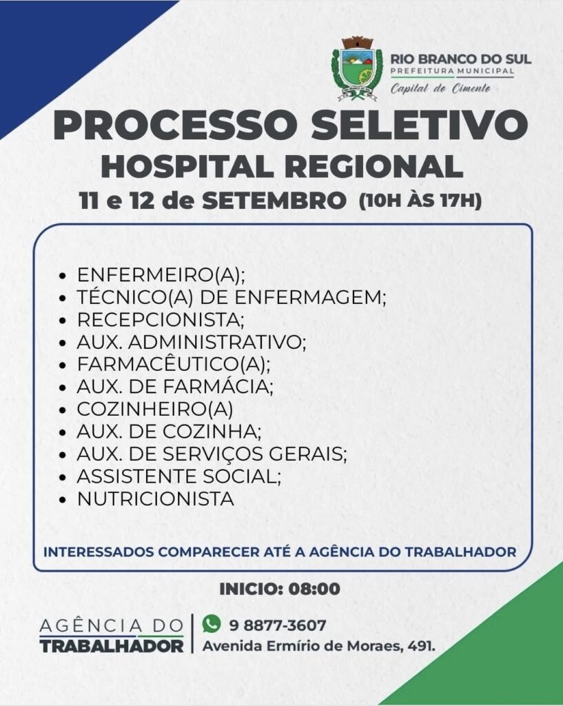 O novo Hospital Municipal de Rio Branco do Sul, que será inaugurado em breve, já está em fase de contratação de profissionais. O processo seletivo acontece nesta quinta e sexta-feira (11 e 12 de setembro) na Agência do Trabalhador, no centro da cidade. As vagas contemplam diferentes áreas de atuação, entre elas: enfermagem, farmácia, nutrição, […]
