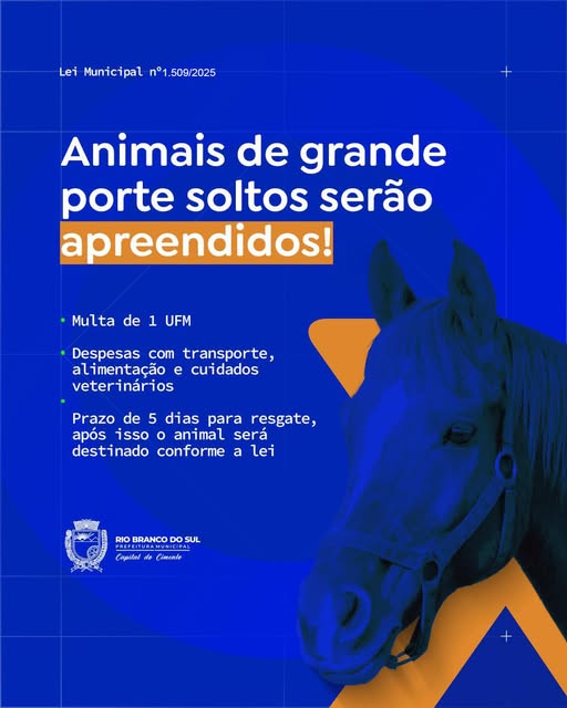 Atenção, proprietários de animais de grande porte! Conforme a Lei Municipal nº 1.509/2025, animais soltos ou amarrados em vias públicas, sem acompanhamento do responsável, serão apreendidos. Para o resgate, o proprietário deverá arcar com: • Multa de 1 UFM (com possibilidade de aumento em caso de reincidência); • Despesas de transporte, alojamento, alimentação, cuidados veterinários […]