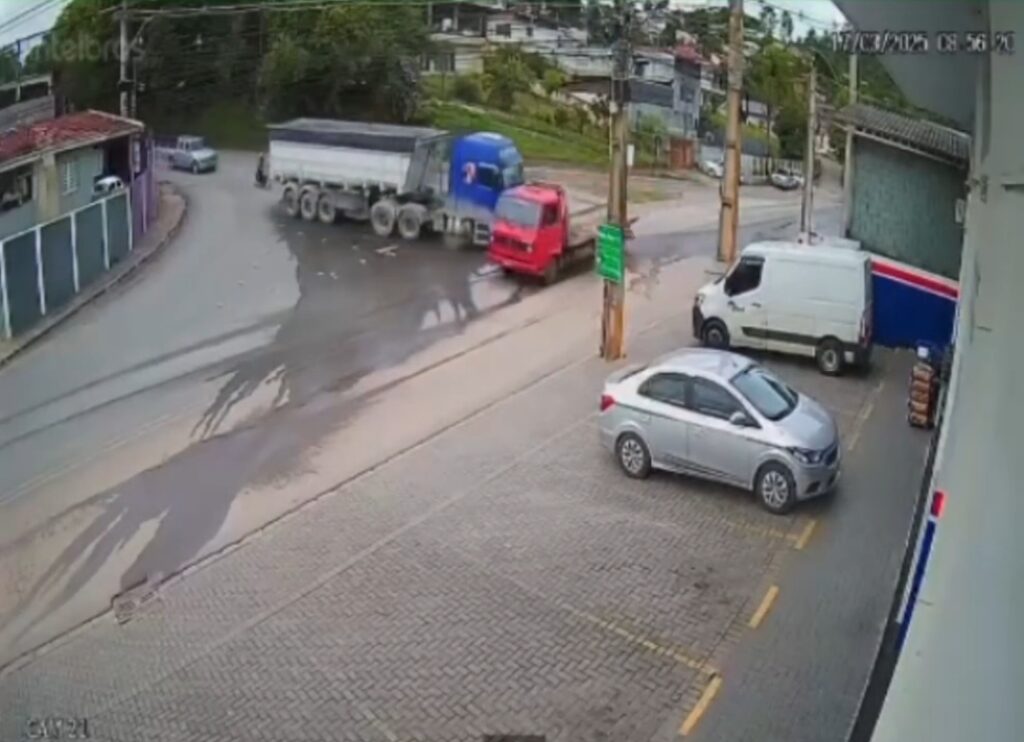 Na manhã desta segunda-feira (17), um grave acidente foi registrado no bairro Jardim dos Minérios, em Rio Branco do Sul, envolvendo uma carreta e um caminhão guincho. Câmeras de segurança da região flagraram o momento exato da colisão, que aconteceu com grande impacto.