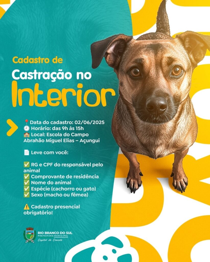 A Prefeitura de Rio Branco do Sul realiza, na próxima segunda-feira, dia 02 de junho, o cadastro para castração gratuita de cães e gatos na localidade do Açungui. A ação tem como objetivo promover a saúde animal e o controle populacional, além de contribuir para a redução do abandono.