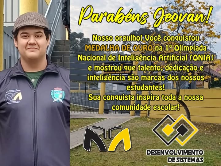 A gestĂŁo do ColĂ©gio Estadual Maria da Luz Furquim tem motivos de sobra para comemorar: o aluno Jeovan, da 3ÂȘ sĂ©rie do Curso TĂ©cnico em Desenvolvimento de Sistemas, conquistou medalha de OURO na 1ÂȘ edição da OlimpĂada Nacional de InteligĂȘncia Artificial (ONIA), figurando entre os 28 melhores do paĂs.